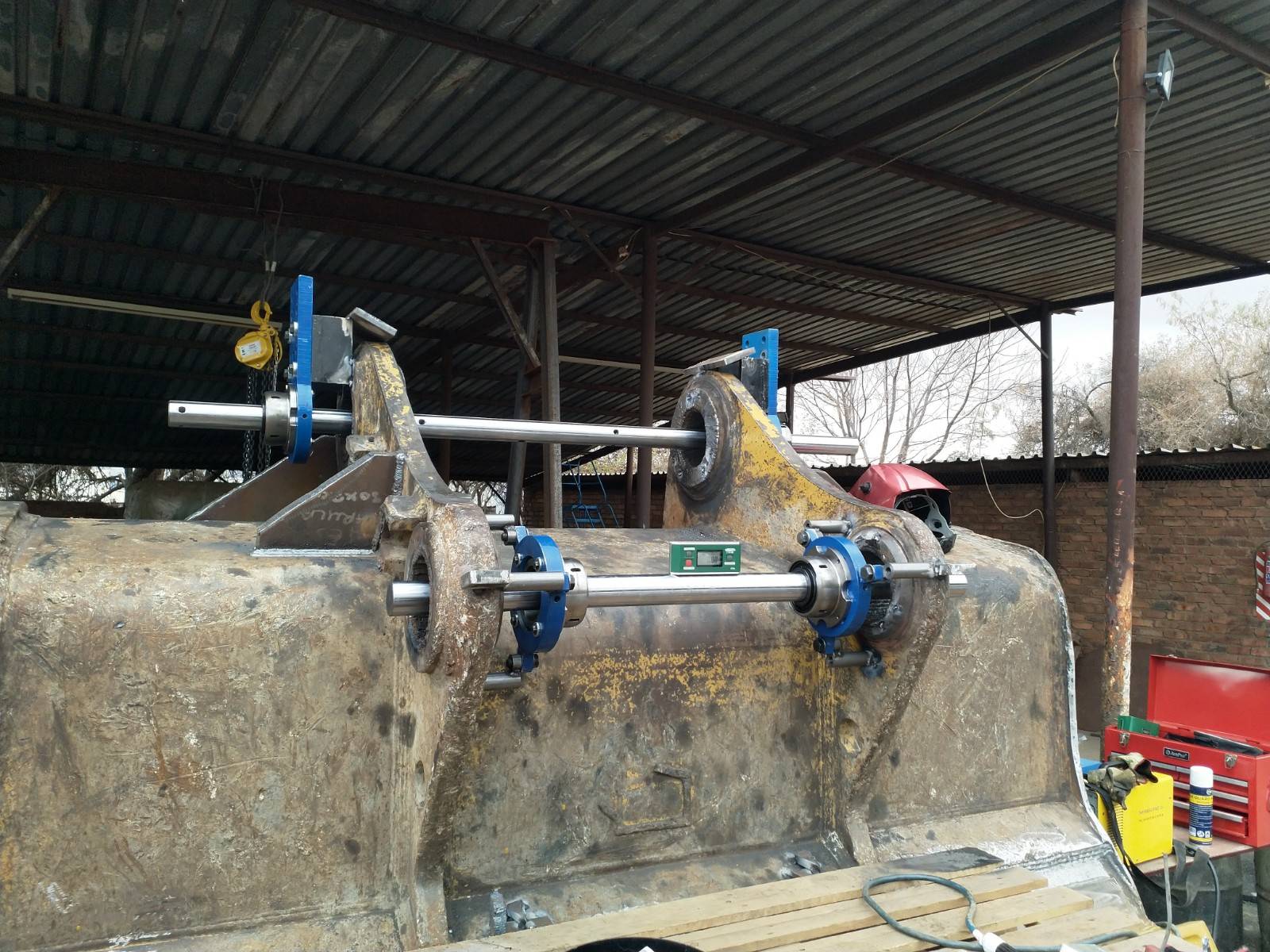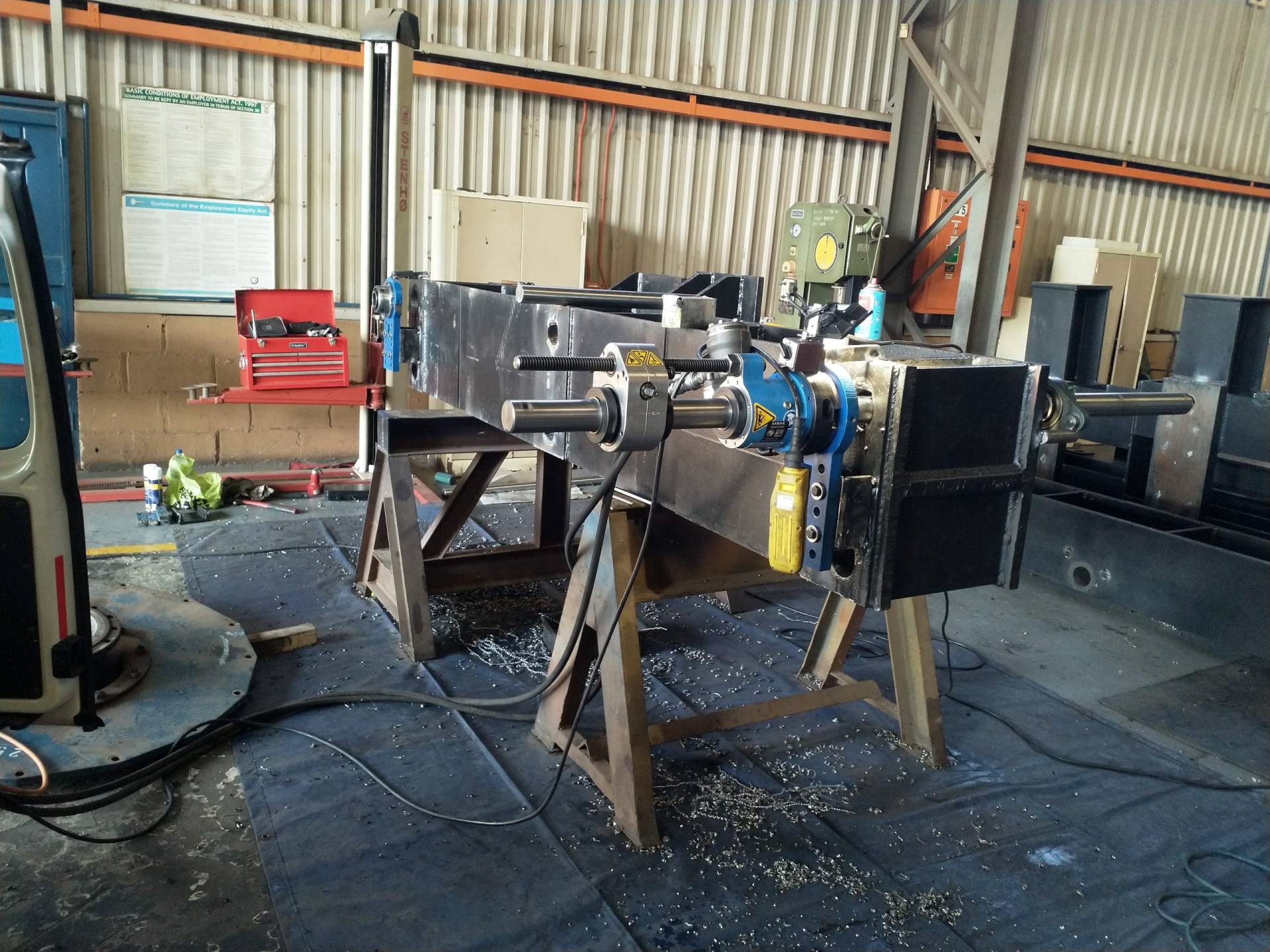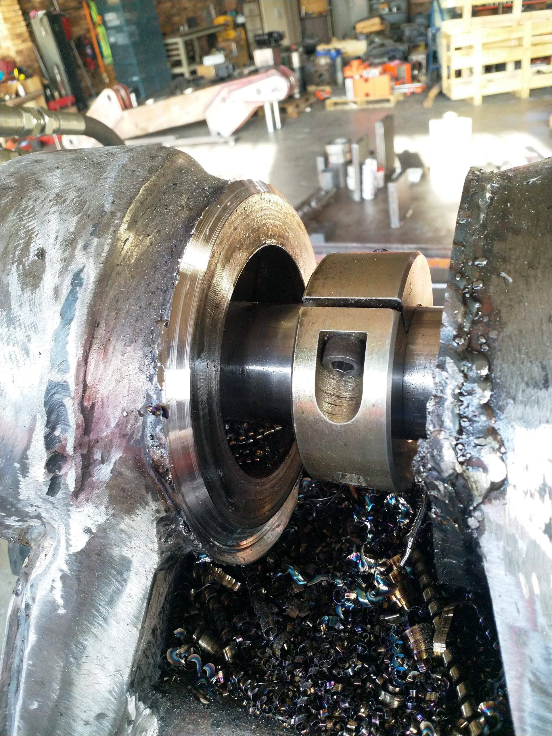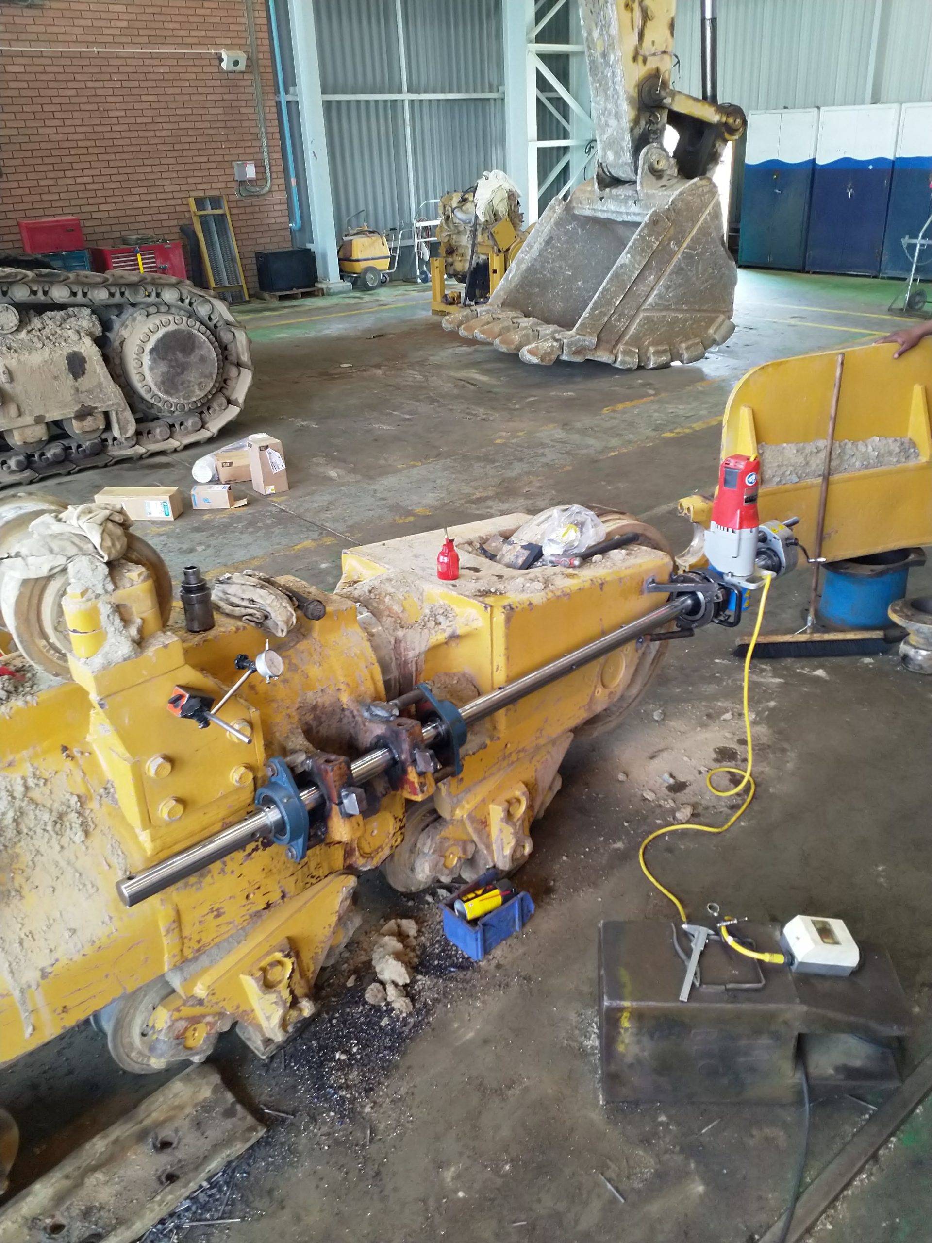 Line boring is the process where the inside diameter of existing worn bores are reduced by means of welding and then machined back to original equipment manufacturer specifications, making the centrelines of two or more bores collinear. Collinear bores appear in several large machine components such as excavator booms, sticks and buckets, dump truck bowls, gearboxes, presses. Precision alignment is of utmost importance on these machines, which is why line boring is commonly used to repair multiple collinear worn bores. Mobile line boring services are becoming the preferred service chosen by clients due to the high transport and road freight permit costs of large machine components.