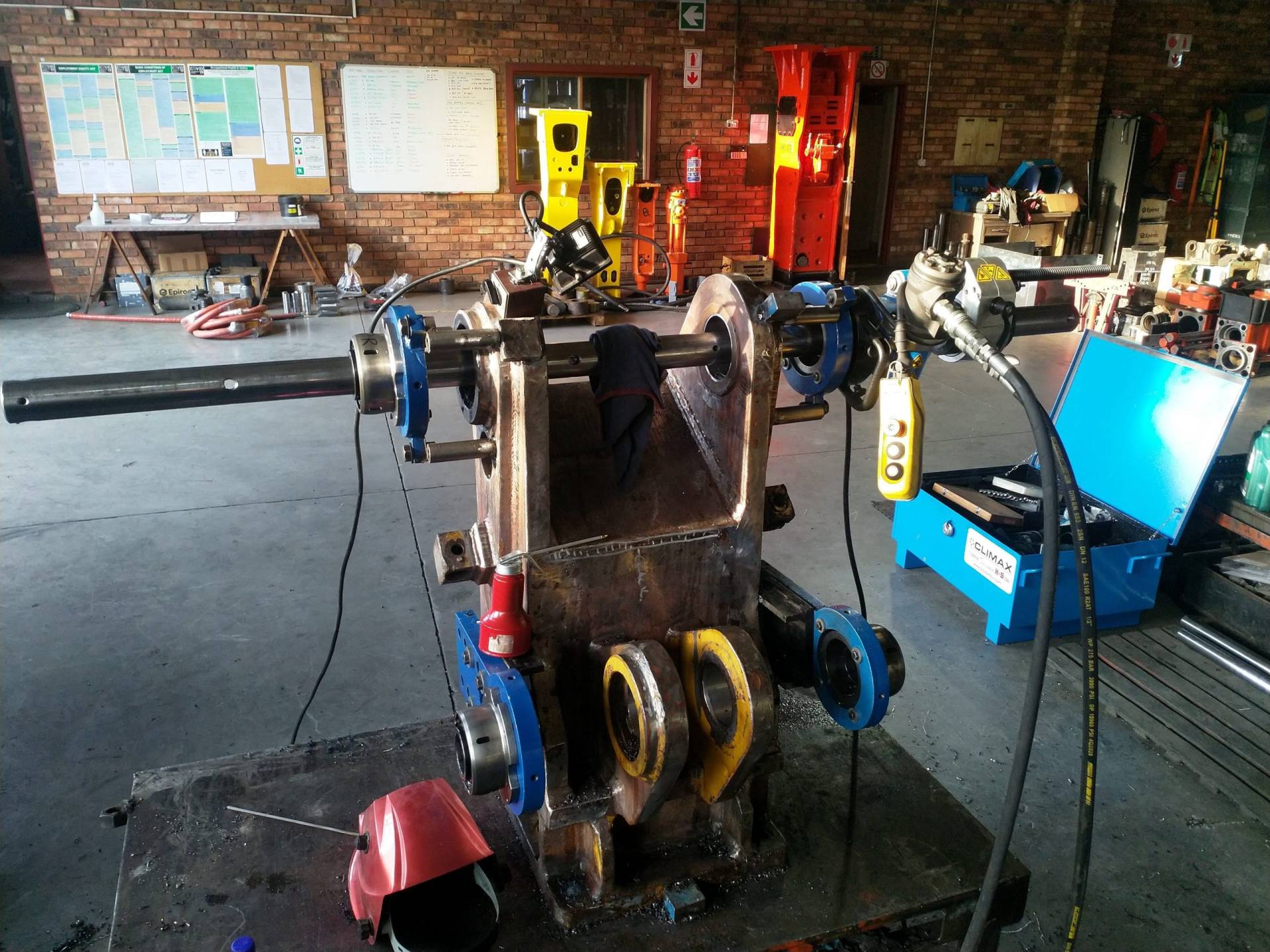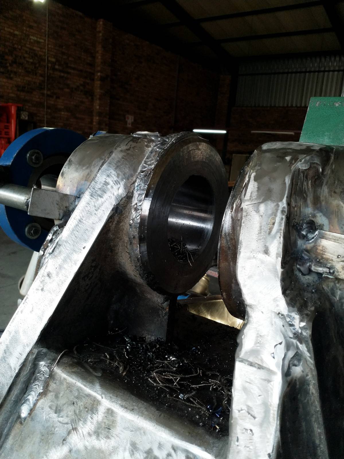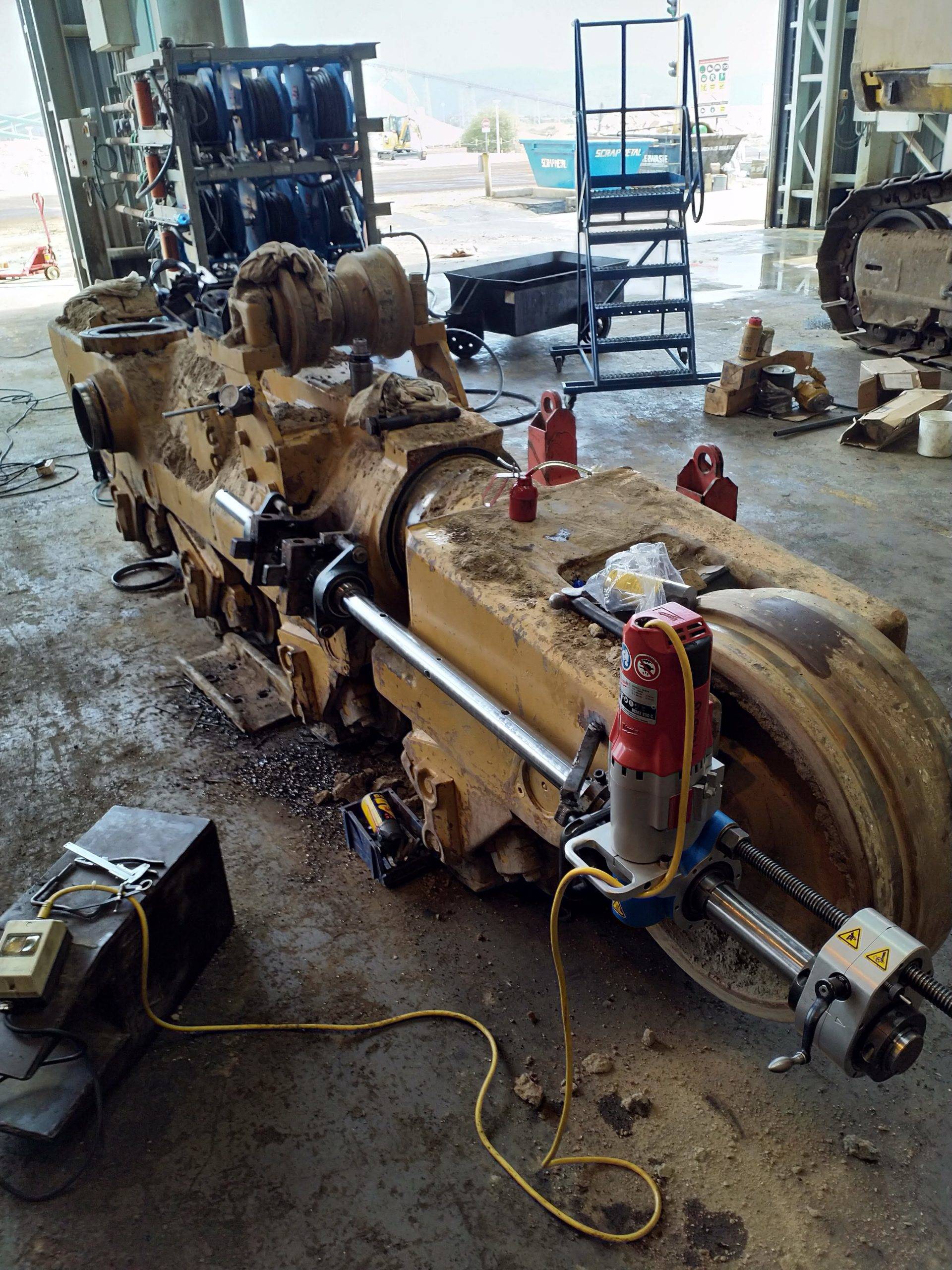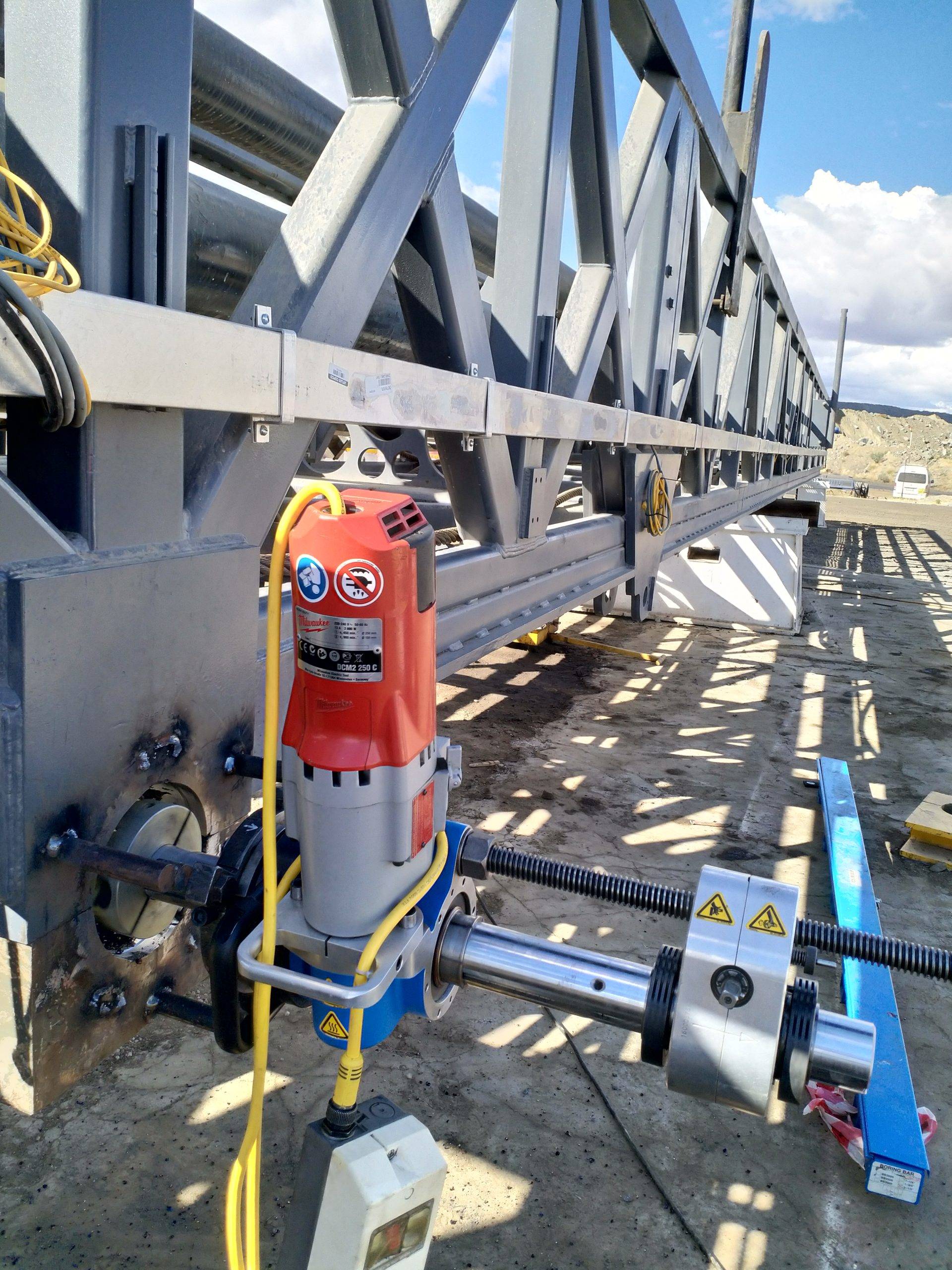 Line boring is the process where the inside diameter of existing worn bores are reduced by means of welding and then machined back to original equipment manufacturer specifications, making the centrelines of two or more bores collinear. Collinear bores appear in several large machine components such as excavator booms, sticks and buckets, dump truck bowls, gearboxes, presses. Precision alignment is of utmost importance on these machines, which is why line boring is commonly used to repair multiple collinear worn bores. Mobile line boring services are becoming the preferred service chosen by clients due to the high transport and road freight permit costs of large machine components.